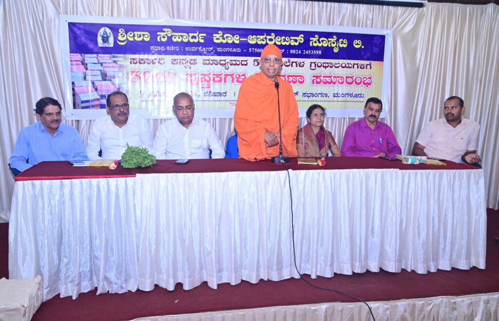 ಶ್ರೀಶಾ ಸೌಹಾರ್ದ ಕೋ ಆಪರೇಟಿವ್ ಸೊಸೈಟಿ ವತಿಯಿಂದ ಶನಿವಾರ ಶ್ರೀನಿವಾಸ ಹೊಟೇಲ್ ಸಭಾಂಗಣದಲ್ಲಿ ಜರಗಿದ ಸಮಾರಂಭದಲ್ಲಿ 50 ಸರಕಾರಿ ಕನ್ನಡ ಮಾಧ್ಯಮ ಶಾಲೆಗಳ ಗ್ರಂಥಾಲಯಗಳಿಗೆ 5,000 ಪುಸ್ತಕಗಳ ವಿತರಣಾ ಸಮಾರಂಭದಲ್ಲಿ ಆಶೀರ್ವಚನ ನೀಡಿದರು.