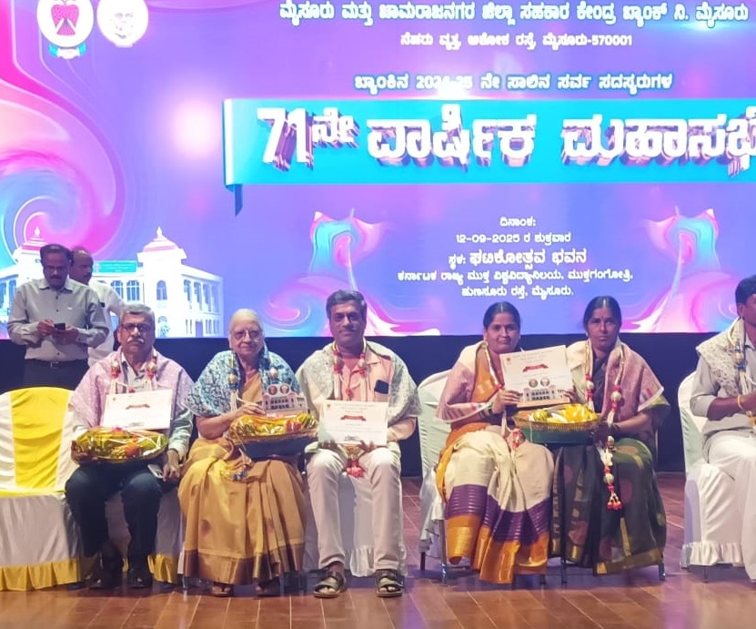 ಮೈಸೂರು: ಇತ್ತೀಚೆಗೆ ನಡೆದ ಮೈಸೂರು ಚಾಮರಾಜನಗರ ಜಿಲ್ಲಾ ಕೇಂದ್ರ ಸಹಕಾರ ಬ್ಯಾಂಕ್ನ 71ನೇ ವಾರ್ಷಿಕ ಮಹಾಸಭೆಯಲ್ಲಿ ಮೈಸೂರು ಜಯನಗರದ ಸಪ್ತರ್ಷಿ ಸೌಹಾರ್ದ ಸಹಕಾರಿ ಸಂಘಕ್ಕೆ ಉತ್ತಮ ಸೌಹಾರ್ದ ಸಹಕಾರಿ ಸಂಘ ಎಂದು ಗುರುತಿಸಿ ಗೌರವಿಸಲಾಯಿತು.
