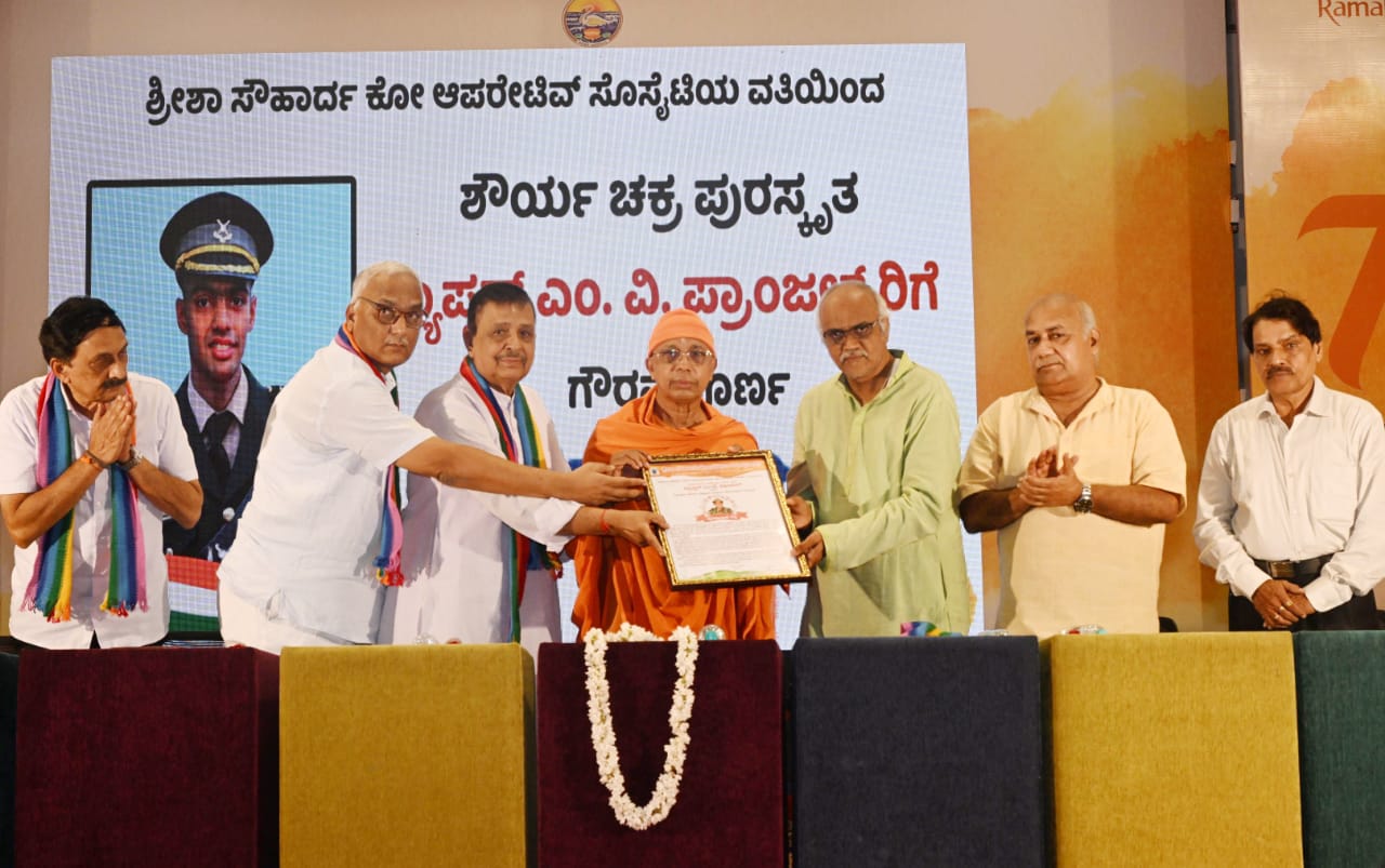 ಮಂಗಳೂರು: ಕರ್ನಾಟಕ ಸೌಹಾರ್ದ ಸಹಕಾರಿ ಕಾಯ್ದೆ ಜಾರಿಯಾಗಿ 25 ವರ್ಷಗಳು ಆಗಿರುವ ಶುಭ ಸಂದರ್ಭದಲ್ಲಿ ಮಂಗಳೂರಿನ ಶ್ರೀಶಾ ಸೌಹಾರ್ದ ಕೋ-ಆಪರೇಟಿವ್ ಸೊಸೈಟಿ ವತಿಯಿಂದ ವಿಭಿನ್ನ ರೀತಿಯ ಸಮಾಜಮುಖಿ ಕಾರ್ಯಕ್ರಮಗಳನ್ನು ಮಂಗಳಾದೇವಿಯ ರಾಮಕೃಷ್ಣ ಆಶ್ರಮದ ಸಭಾಂಗಣದಲ್ಲಿ ಭಾನುವಾರ ಹಮ್ಮಿಕೊಳ್ಳಲಾಯಿತು. ವಿಶೇಷ ಕಾರ್ಯಕ್ರಮದ ಅಂಗವಾಗಿ ದೇಶಸೇವೆಯ ಕೈಂಕರ್ಯದಲ್ಲಿ ವೀರಮರಣವನ್ನಪ್ಪಿದ ಕ್ಯಾ.ಪ್ರಾಂಜಲ್ ಅವರ ಸ್ಮರಣೆಗಾಗಿ ಪ್ರಾಂಜಲ್ ಸ್ಮರಣಾoಜಲಿ ಹಮ್ಮಿಕೊಳ್ಳಲಾಯಿತು.