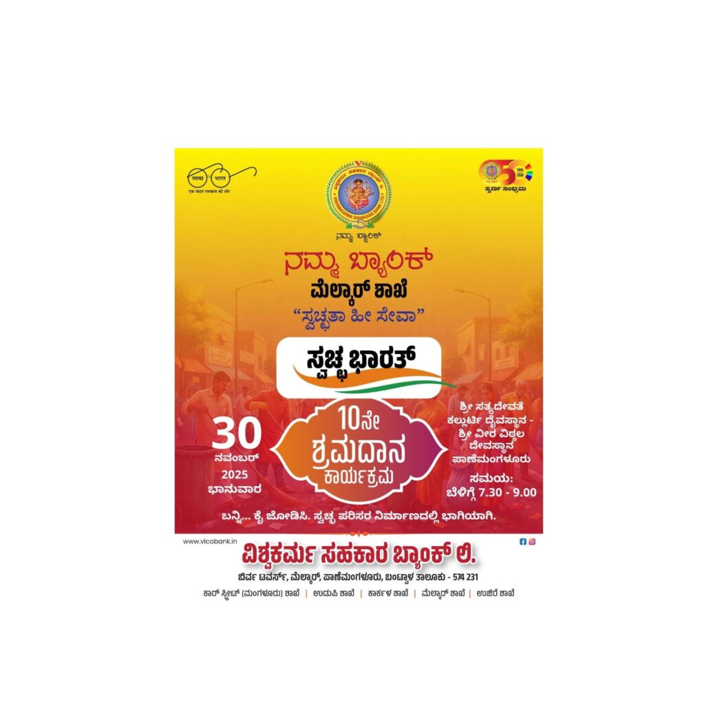 ಸ್ವಚ್ಛತಾ ಹೀ ಸೇವಾ ಎಂಬ ಧ್ಯೇಯದಡಿ ವಿಶ್ವಕರ್ಮ ಸಹಕಾರ ಬ್ಯಾಂಕ್ ತಮ್ಮ ಐದೂ ಶಾಖೆಗಳ ನೇತೃತ್ವದಲ್ಲಿ ಸ್ವಚ್ಛತಾ ಕಾರ್ಯಕ್ರಮ ಆಯೋಜಿಸುತ್ತಿದೆ. ಭಾನುವಾರ ಮೆಲ್ಕಾರ್ ಶಾಖೆಯ ನೇತೃತ್ವದಲ್ಲಿ ಶ್ರೀ ಸತ್ಯದೇವತೆ ಕಲ್ಲುರ್ಟಿ ದೈವಸ್ಥಾನ, ಶ್ರೀ ವೀರ ವಿಠ್ಠಲ ದೇವಸ್ಥಾನ ಪಾಣೆಮಂಗಳೂರು ಪರಿಸರದಲ್ಲಿ ಸ್ವಚ್ಛತಾ ಶ್ರಮದಾದನ ಜರುಗಲಿದ್ದು, ಈ ಸಾಮಾಜಿಕ ಕಾರ್ಯದಲ್ಲಿ ಭಾಗವಹಿಸಿ ಸ್ವಚ್ಛಂದ ಪರಿಸರದ ರಾಯಭಾರಿಗಳಾಗಬೇಕೆಂದು ಬ್ಯಾಂಕ್ ಪ್ರಕಟಣೆಯಲ್ಲಿ ತಿಳಿಸಿದೆ.