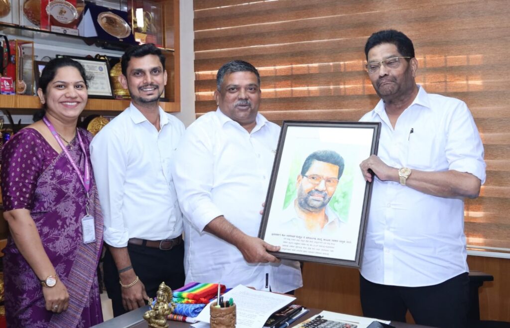 ಹಳೆಯಂಗಡಿ: 72ನೇ ಅಖಿಲ ಭಾರತ ಸಹಕಾರಿ ಸಪ್ತಾಹ ಆಚರಣೆಯ ಸಂಧರ್ಭದಲ್ಲಿ ಹಳೆಯಂಗಡಿಯ ಪ್ರಿಯದರ್ಶಿನಿ ಕೋ ಆಪರೇಟಿವ್ ಸೊಸೈಟಿಯಲ್ಲಿ ಹಮ್ಮಿಕೊಂಡ ಸಹಕಾರ ರತ್ನ ಡಾ. ಎಂ ಎನ್ ರಾಜೇಂದ್ರ ಕುಮಾರ್ ಅವರ ಚಿತ್ರ ಬಿಡಿಸುವ ಸ್ಪರ್ಧೆಯಲ್ಲಿ ಮೊದಲ ಬಹುಮಾನ ಪಡೆದ ಚಿತ್ರವನ್ನು ಸೋಮವಾರ ಡಾ.ರಾಜೇಂದ್ರ ಕುಮಾರ್ ಅವರಿಗೆ ಹಸ್ತಾಂತರ ಮಾಡಲಾಯಿತು.