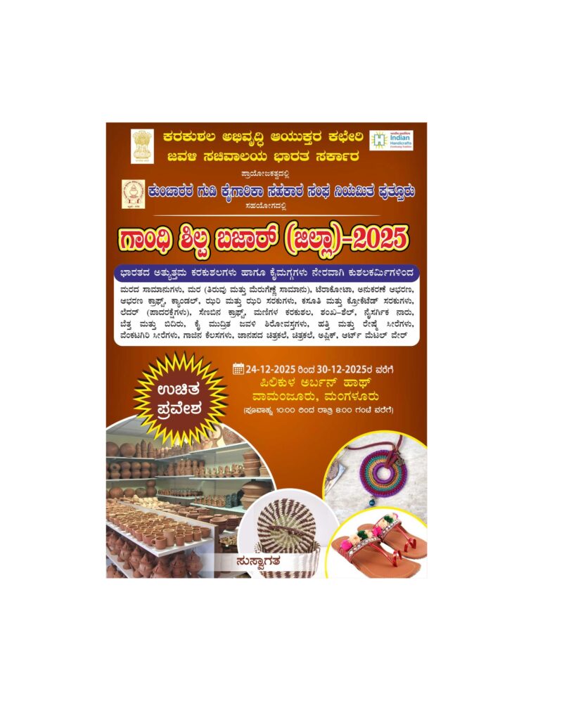 ಮಂಗಳೂರು: ಗ್ರಾಮೀಣ ಕರಕುಶಲ ಕಲೆಗಳನ್ನು ಪ್ರೋತ್ಸಾಹಿಸುವ ನಿಟ್ಟಿನಲ್ಲಿ ಪುತ್ತೂರಿನ ಕುಂಬಾರರ ಗುಡಿ ಕೈಗಾರಿಕಾ ಸಹಕಾರ ಸಂಘವು, ಕೇಂದ್ರ ಸರಕಾರದ ಜವಳಿ ಸಚಿವಾಲಯದ ಆಶ್ರಯದಲ್ಲಿ ಪಿಲಿಕುಳ ನಿಸರ್ಗಧಾಮದಲ್ಲಿ ಏಳು ದಿನಗಳ ಕಾಲ ಗಾಂಧಿ ಶಿಲ್ಪ ಬಜಾರ್ 2025 ಕರಕುಶಲ ಮೇಳ ಹಮ್ಮಿಕೊಂಡಿದೆ.