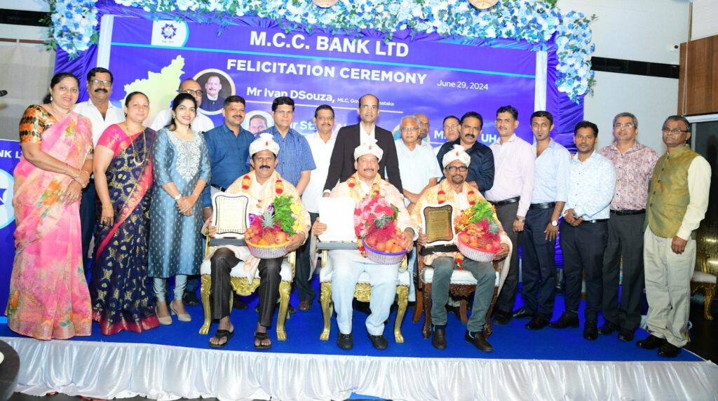 Mangalore: Newly appointed Vidhan Parishad member Ivan D’Souza, Karnataka Konkani Sahitya Academy President Stany Alwaris and Karnataka Byari Sahitya Academy President Umar U.H. was felicitated by MCC Bank Limited on Saturday.